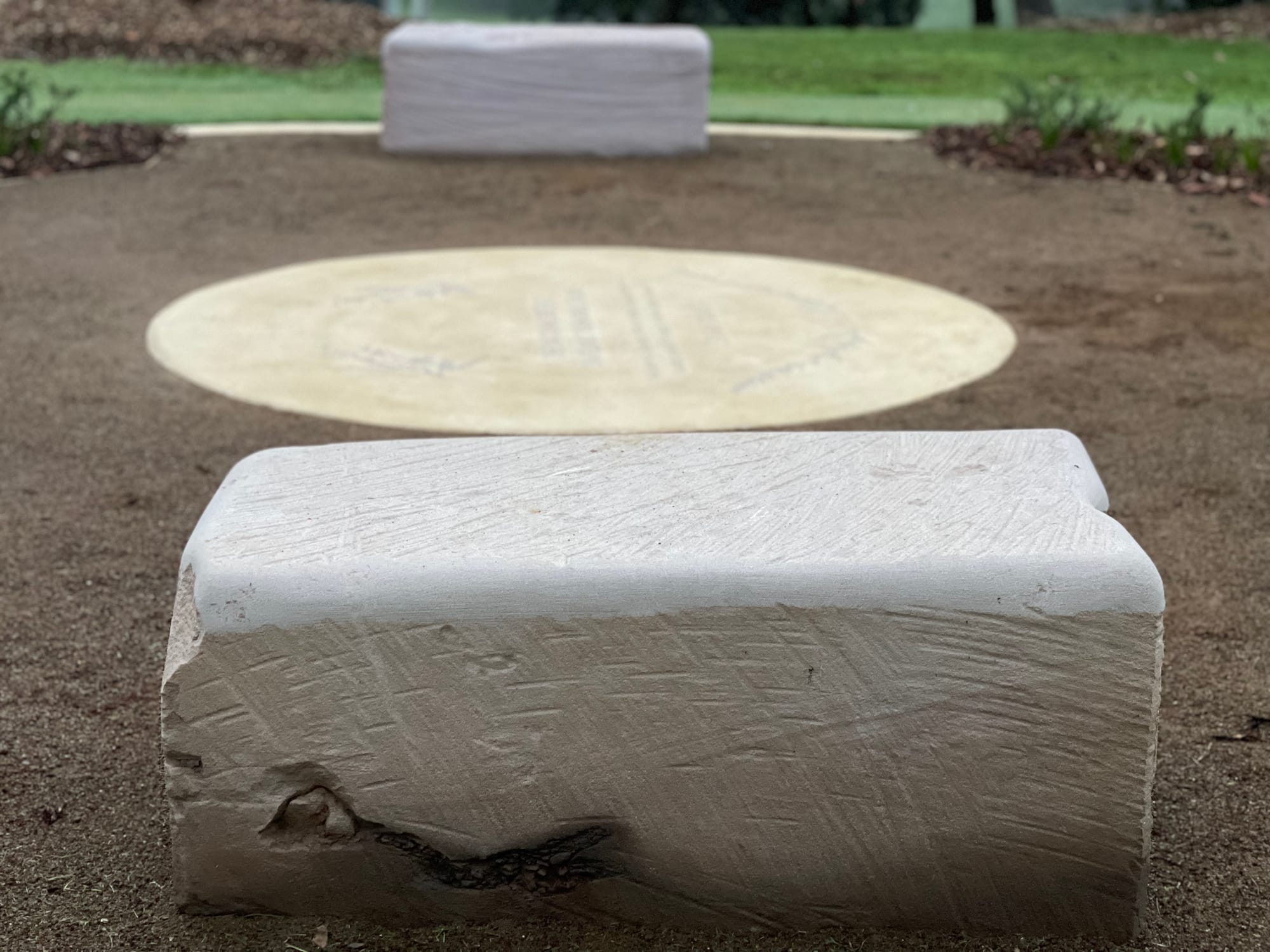 Two years later Council landscaping staff juxtaposed — east and west — heavy blocks of Brisbane sandstone (tuff) to form two seats. Four garden beds of bottlebrush (Callistemons), native rosemary (Westringia) and grasses were then arrayed around a concrete disk centrepiece inscribed with the words, “The National Defence Chaplains’ Memorial Grove. Dedicated to Australian Defence Force Chaplains who have humbly served this nation in times of war and peace. LEST WE FORGET.” Seen from above, the effect invokes a sense of the Maltese Cross motif of ADF Chaplaincy regimental insignia.