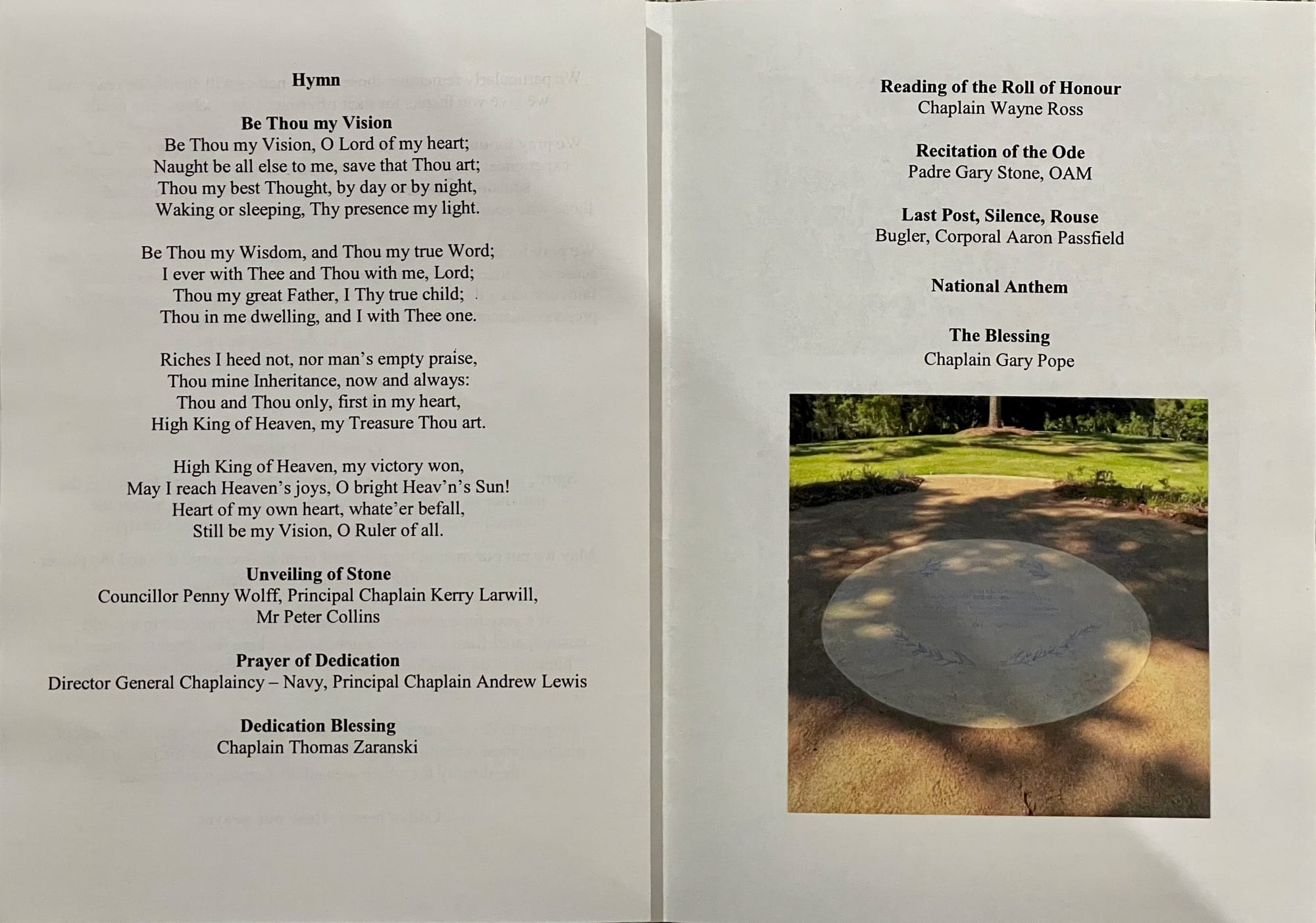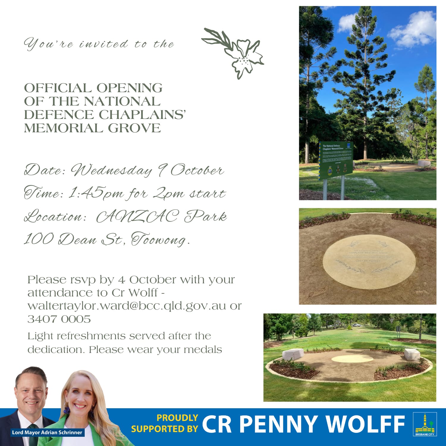 On 9 October 2024 the Memorial Grove was officially unveiled and dedicated in a ceremony attended by more than four dozen serving or veteran ADF Chaplains, representing Army, Royal Australian Navy and Royal Australian Air Force. The event was organised by local Walter Taylor Ward Councillor, Penny Wolff.