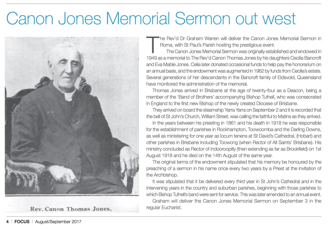 Today the Church of England in Queensland is vigorous and strong as compared with other places, much of that vigour and strength would not have been possible but for the Venerable Thomas Jones.