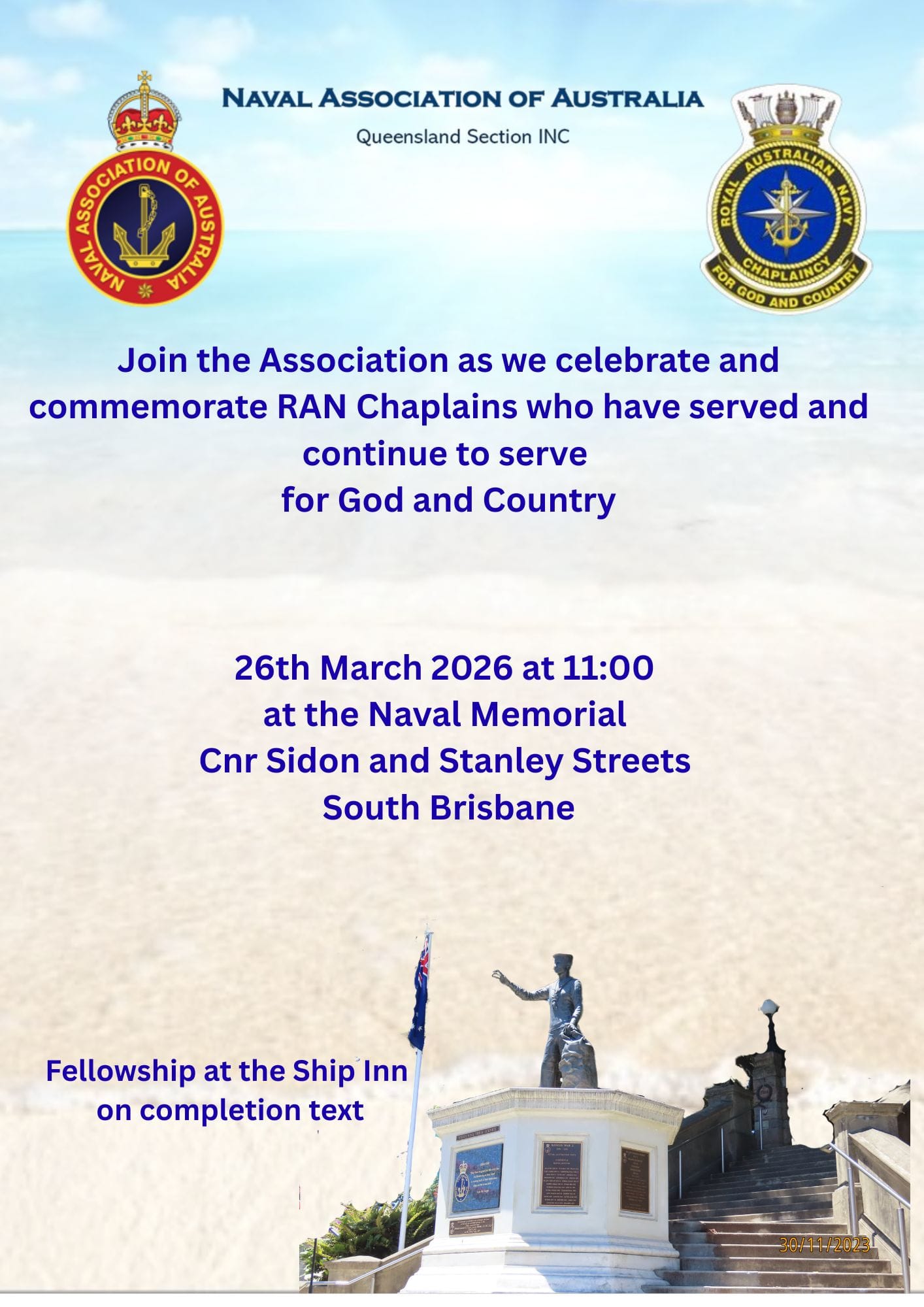 ABOVE: The Naval Association of Queensland (Queensland State Section) flyer for the 26 March 2026 commemoration service honouring Chaplaincy in the Royal Australian Navy.